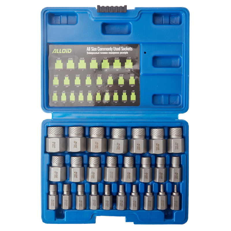 Alloid. Набір екстракторів для витягування зламаних болтів, 25 предметів – набір екстракторів для швидкого вилучення зламаних болтів, шпильок і гвинтів. Призначений для роботи з різьбовими з’єднаннями будь-якої складності, він стане незамінним інструментом у автомайстернях, на СТО, у виробничих цехах і під час домашнього ремонту.