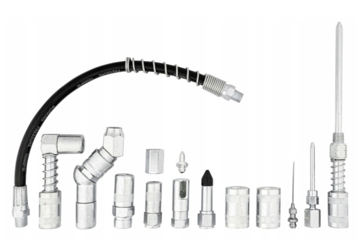 Комплект приладдя/штуцерів для шприців для змащування. Усі адаптери із міцних матеріалів із швидкознімним з'єднувачем у комплекті. У комплекті 7 предметів.