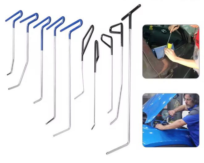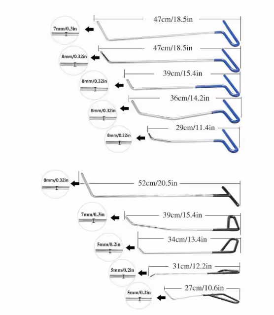 Стержни для удаления вмятин изготовлены из твердой и толстой пружинной стали. Твердость значительно повышена, их нелегко согнуть или сломать.